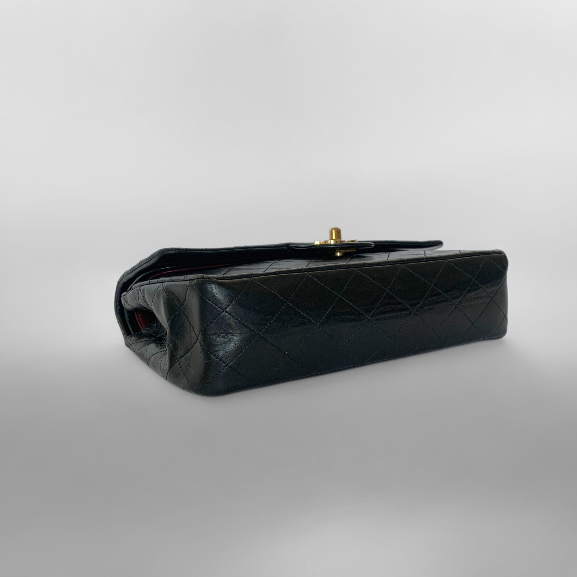 Chanel Classic Flap Bag in a size Medium in black Lambskin Leather. The Chanel Classic Double Flap is one of the most iconic handbags ever created and has been regarded for decades as a symbol of timeless style and elegance. The name “Double Flap” refers to the ingenious design of the bag, where there is an extra flap on the front that covers the zipper. The bag is made of high-quality leather and has a distinctive quilting technique that gives it a luxurious look. The bag's hardware is gold-plated with 24K gold, which is very rare as this is no longer produced this way.
