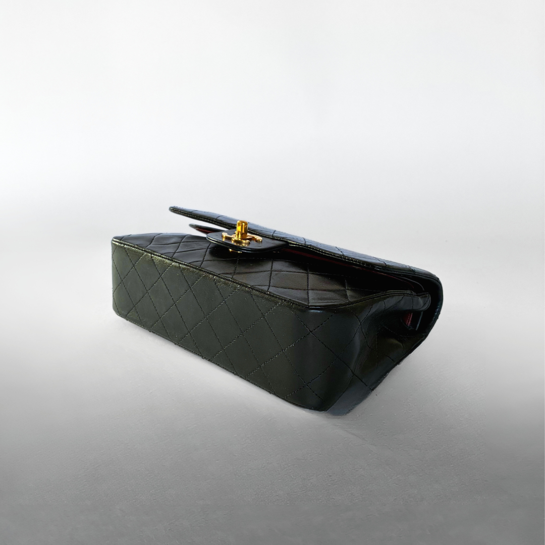 Chanel Classic Flap Bag in a size Small in black Lambskin Leather. The Chanel Classic Double Flap is one of the most iconic handbags ever created and has been regarded for decades as a symbol of timeless style and elegance. The name “Double Flap” refers to the ingenious design of the bag, where there is an extra flap on the front that covers the zipper. The bag is made of high-quality leather and has a distinctive quilting technique that gives it a luxurious look. The hardware of the bag is gold-plated with 24K gold, which is very rare as this is no longer produced this way these days.