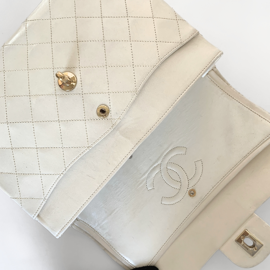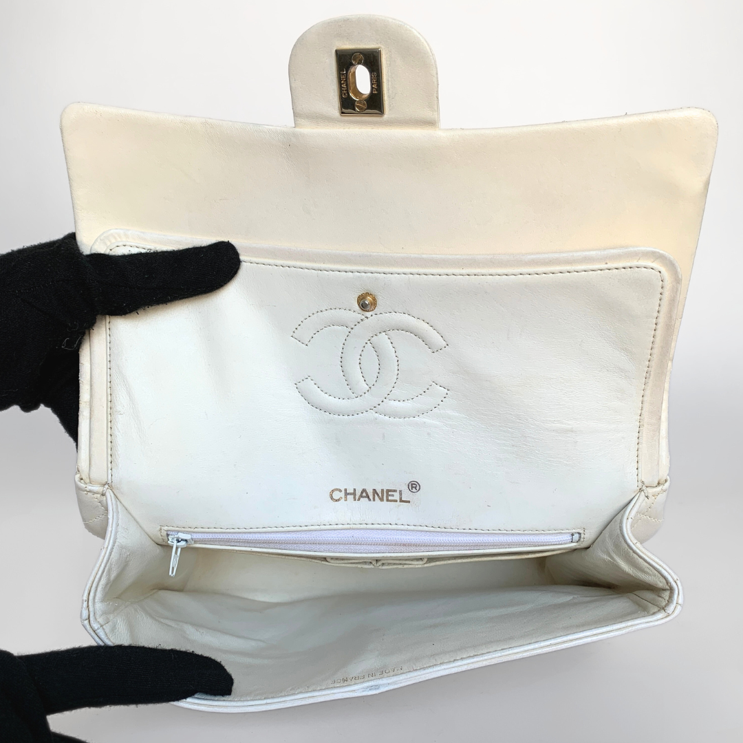 Chanel Classic Flap Bag in a size Medium in white Lambskin Leather. The Chanel Classic Double Flap is one of the most iconic handbags ever created and has been regarded for decades as a symbol of timeless style and elegance. The name “Double Flap” refers to the ingenious design of the bag, where there is an extra flap on the front that covers the zipper. The bag is made of high-quality leather and has a distinctive quilting technique that gives it a luxurious look. The bag's hardware is gold-plated with 24K gold, which is very rare as this is no longer produced this way.