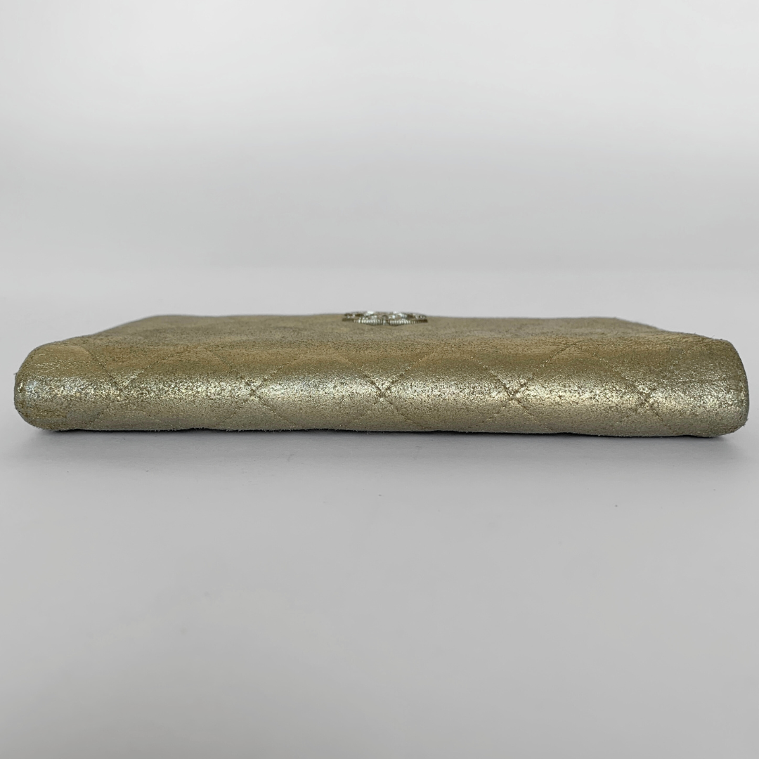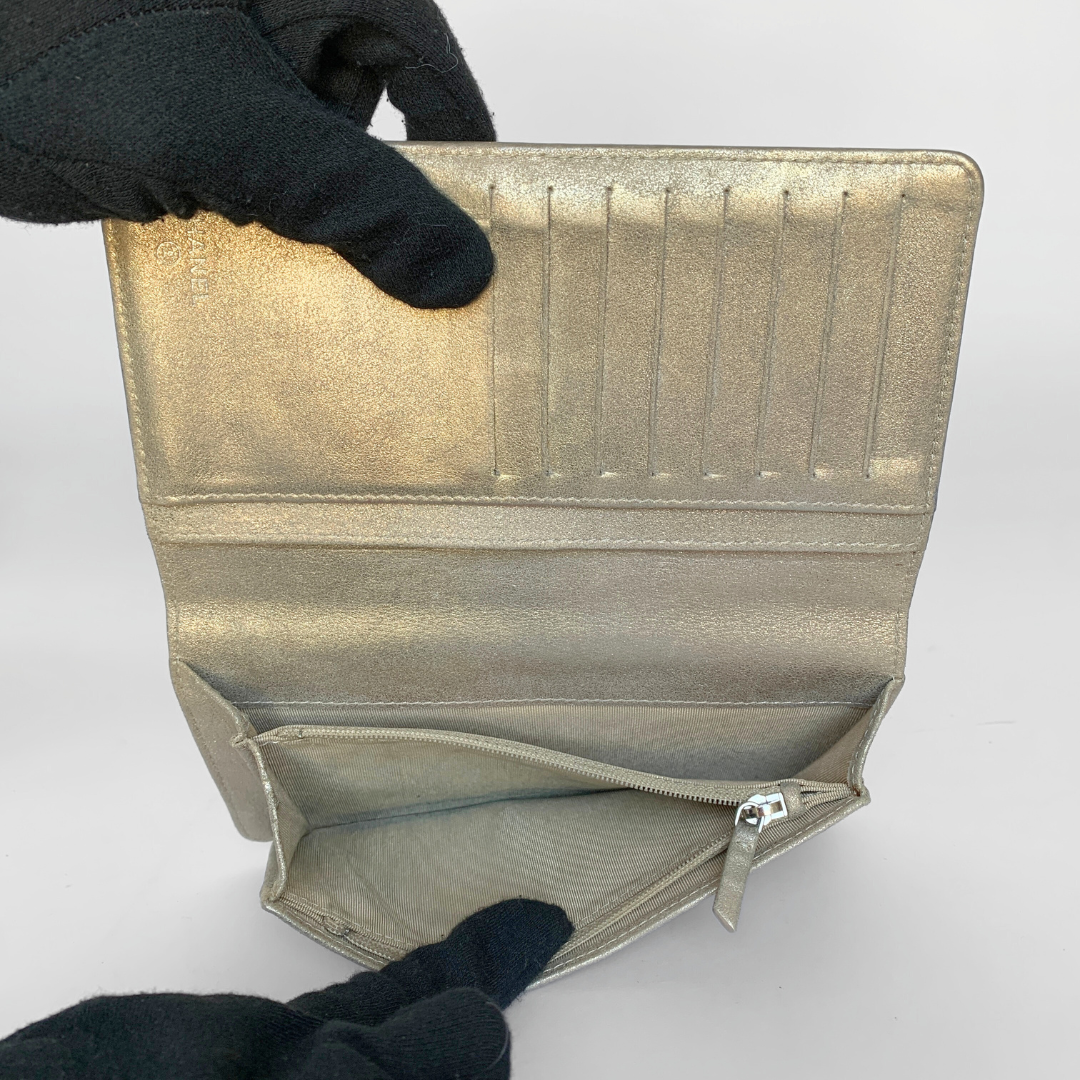 Chanel CC Wallet Large in Gold Calfskin Leather with silver-colored hardware. The wallet is in large size and has a lot of storage to fit your everyday essentials.