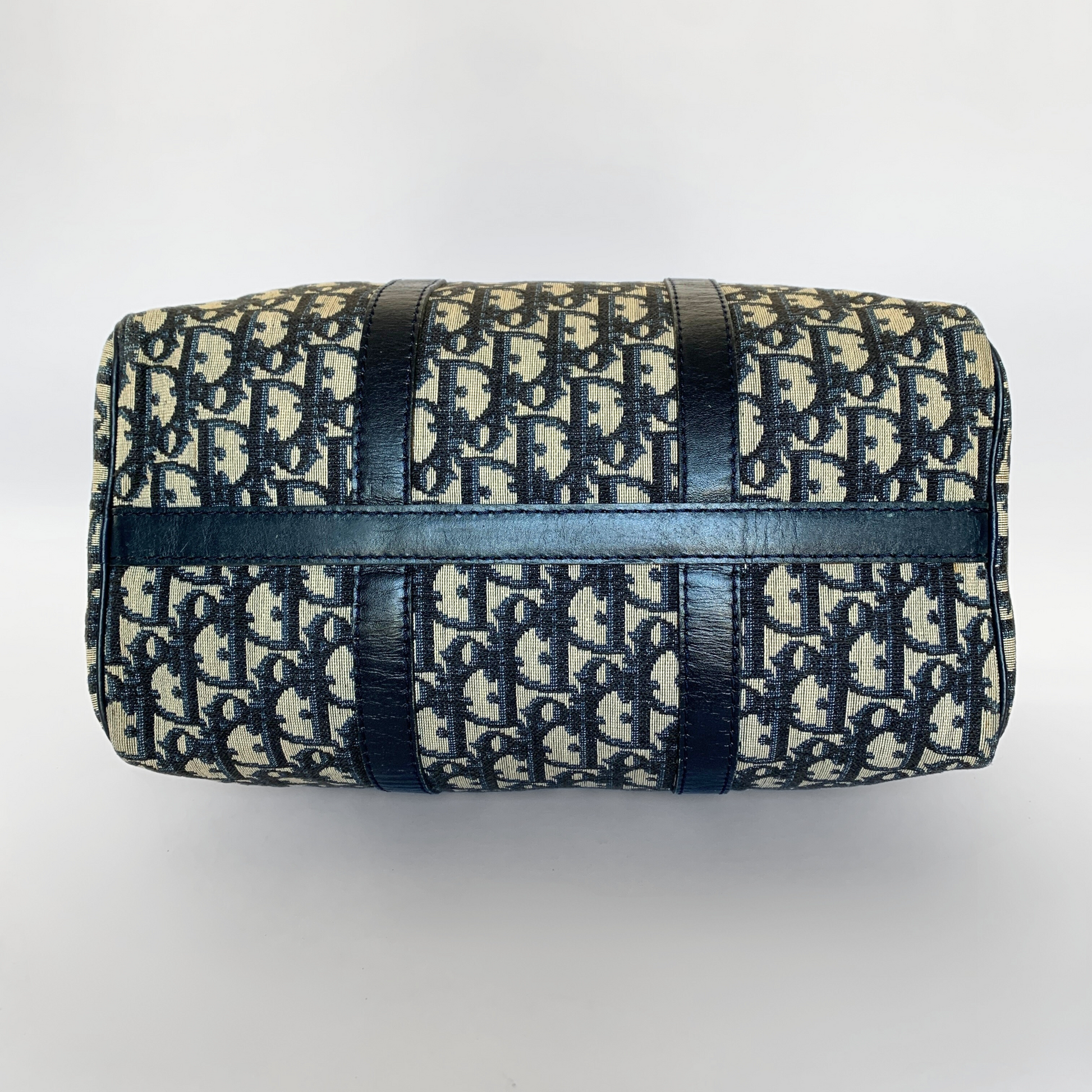 Dior Bowling Bag in a size large in the classic Dior Oblique Canvas, with dark blue leather details. The Dior Oblique Canvas is part of Dior's classic collection. The Bowling Bag has fashion and functionality all rolled into one. With its classic shape and roomy capacity, it is the perfect everyday bag, but can also be used as a small travel bag.