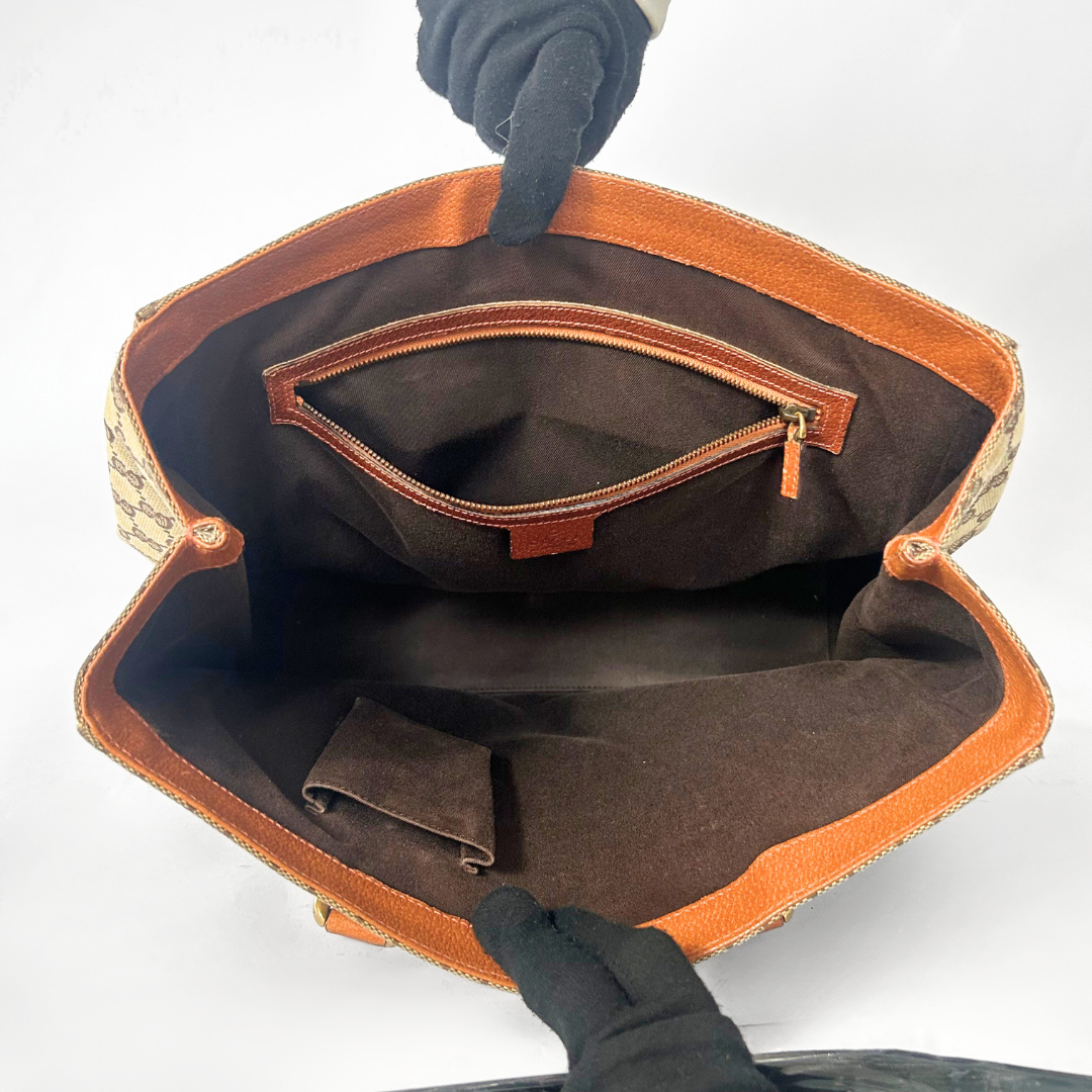 The classic Monogram Canvas has been Gucci's trademark design since it was first introduced in 1969. The Monogram Canvas is composed of two interlocking Gs, which stand for the founder of the brand, Guccio Gucci. Inside the bag there is one big pocket with a zipper and two slip-in pockets.