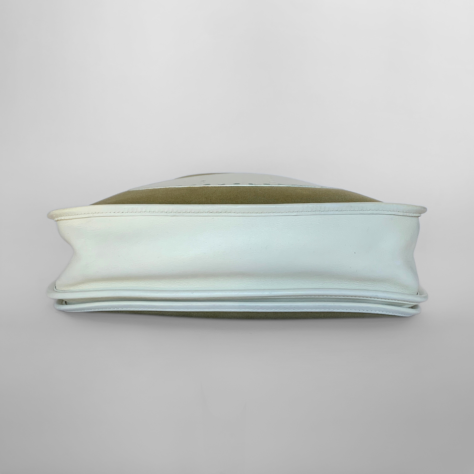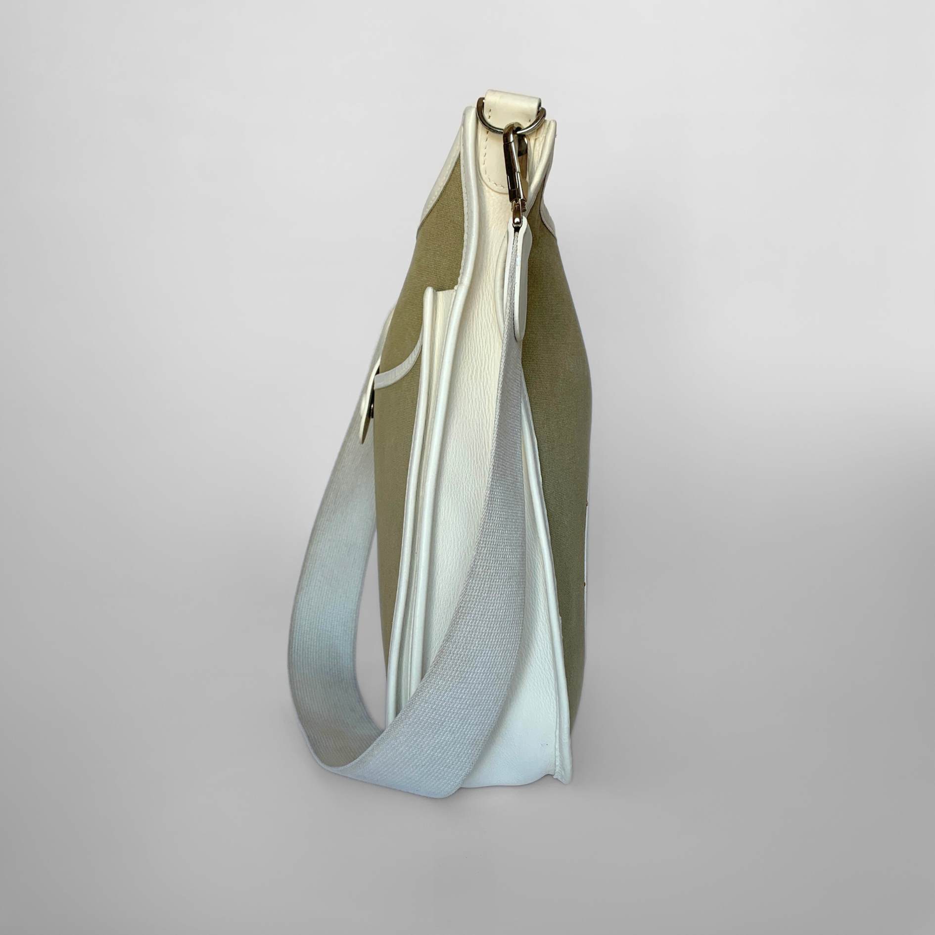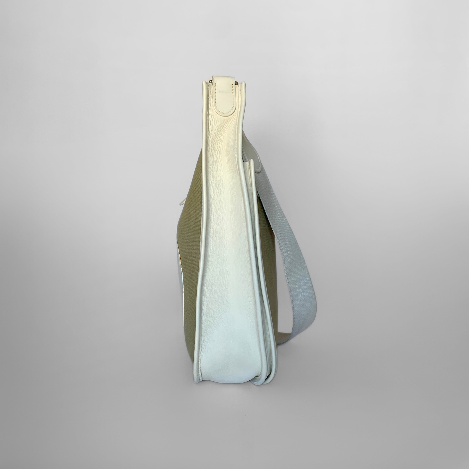 Hermès Evelyne GM, in white Leather with beige canvas. Did you know the Evelyne was created in 1978 by Evelyne Bertrand, head of Hermès Riding department, as a carry-all for horse groomer’s tools? The bag got perforated so brushes and sponges could dry on the go! Though the perforated side is intended to be worn against the body, the H logo has become a coveted design element for luxury lovers.