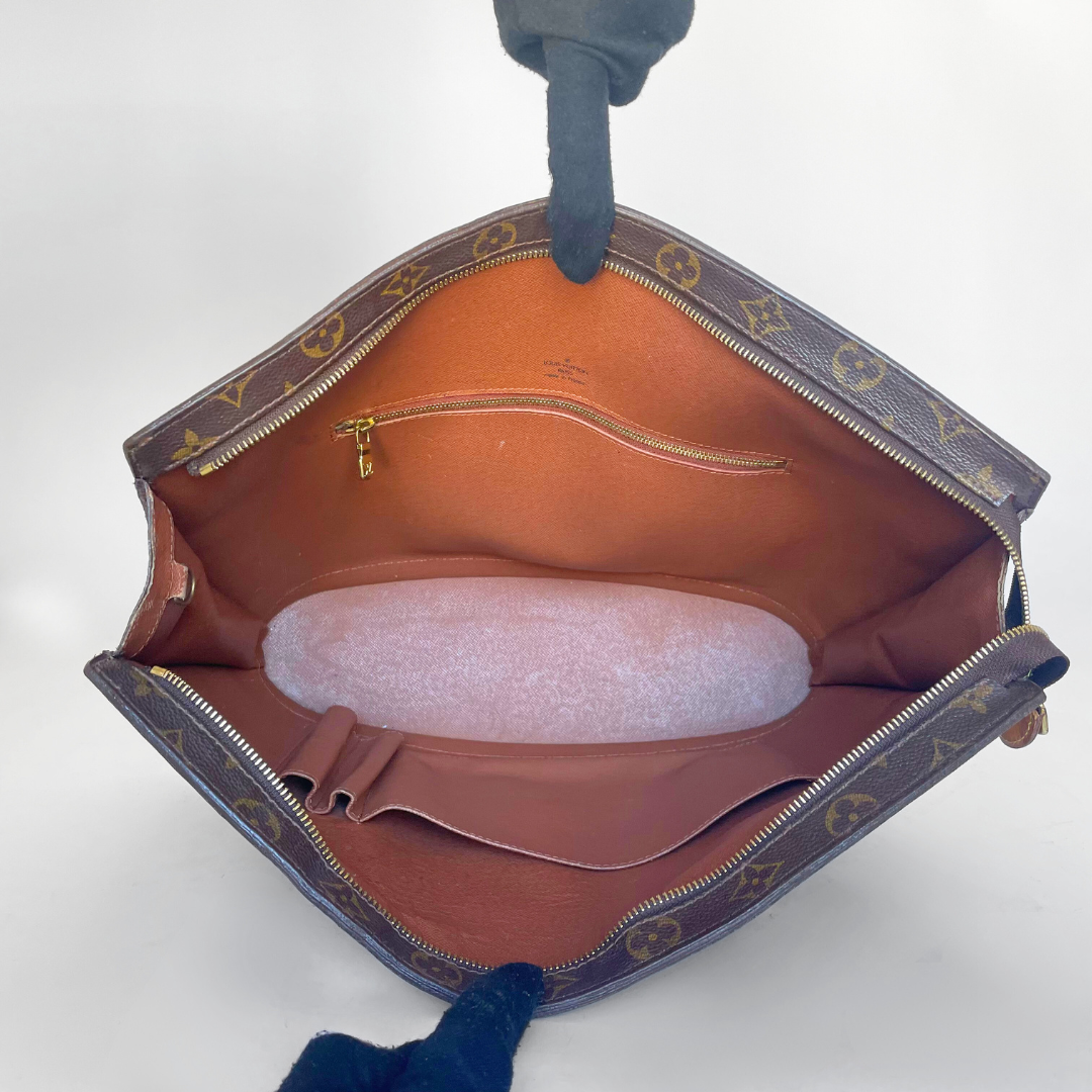 Louis Vuitton Babylon in Monogram Canvas. The bag has Vachetta leather trims and shoulder straps. The hardware is gold-colored. It's the perfect office bag!