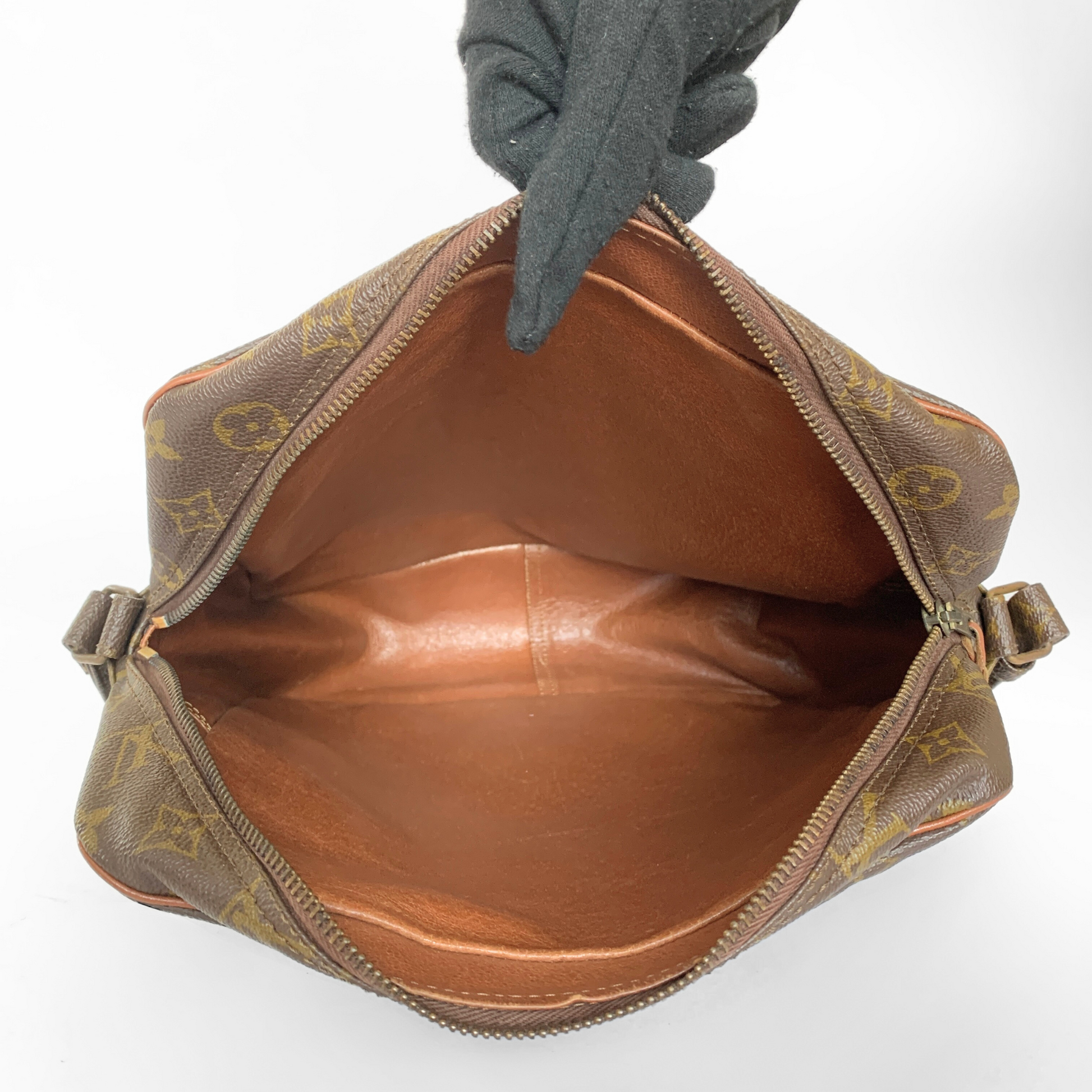The overall condition of this vintage Louis Vuitton Danube crossbody bag is good. The leather on the inside has small scratches and the gold-colored hardware is discolored on some elements. The canvas on the outside is in good condition with some signs of usage. The inside is clean and tidy. This item comes with the authenticity card from our shop.