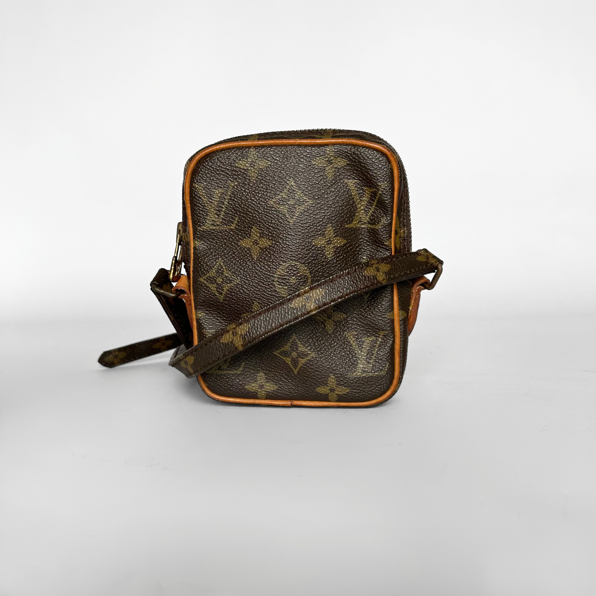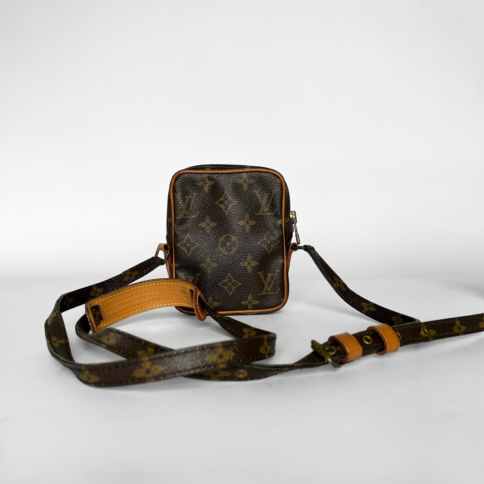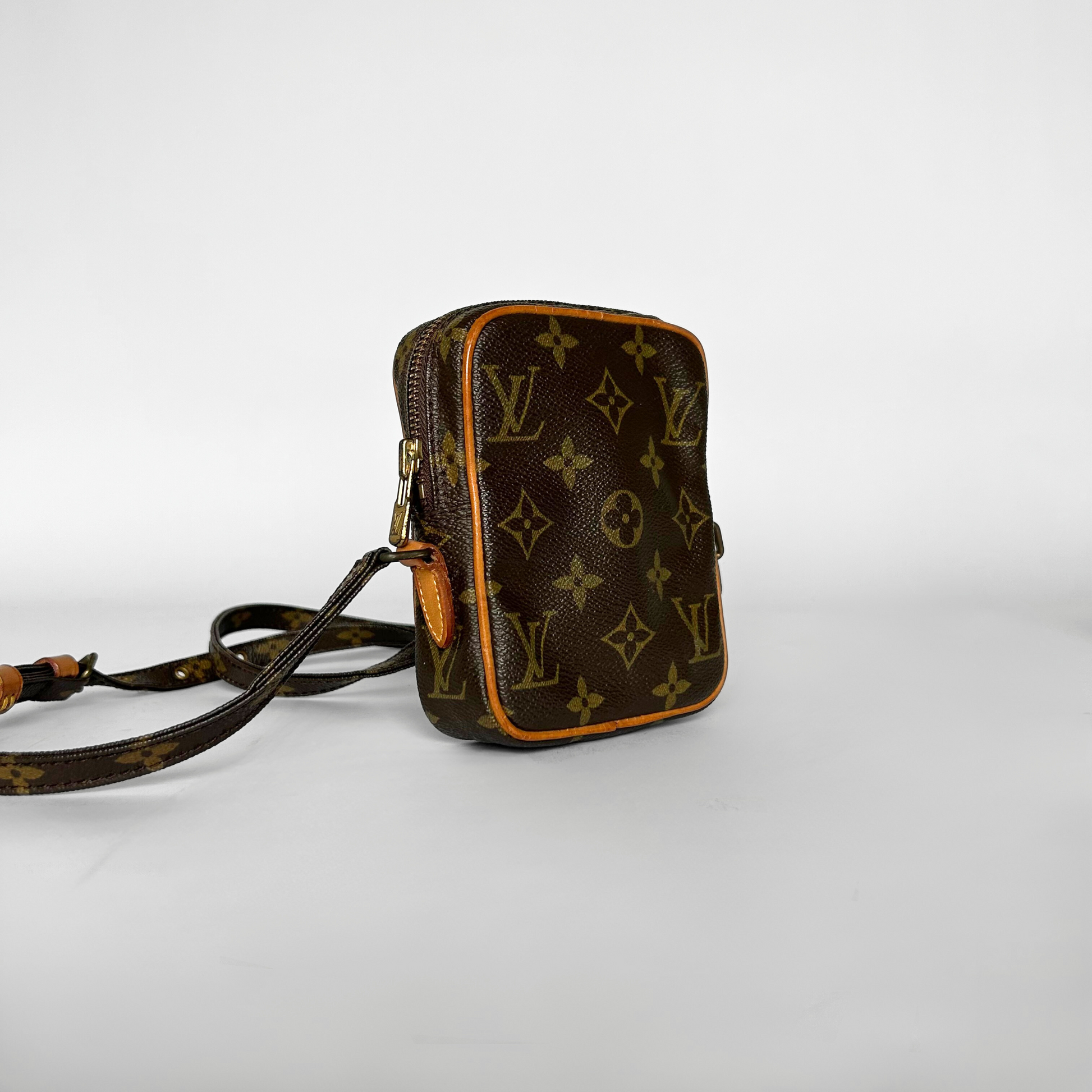 Louis Vuitton Danube Mini in Monogram Canvas. The bag has Vachetta leather details and gold-colored hardware. The classic Monogram Canvas has been Louis Vuitton's trademark design since it was first introduced in 1896. The graphic symbols, including the quatrefoils and flowers, as well as the LV Monogram were used to prevent counterfeiting in the early days when it was first patented. Made of coated canvas, the Monogram's traditional look is also endured by its durability.