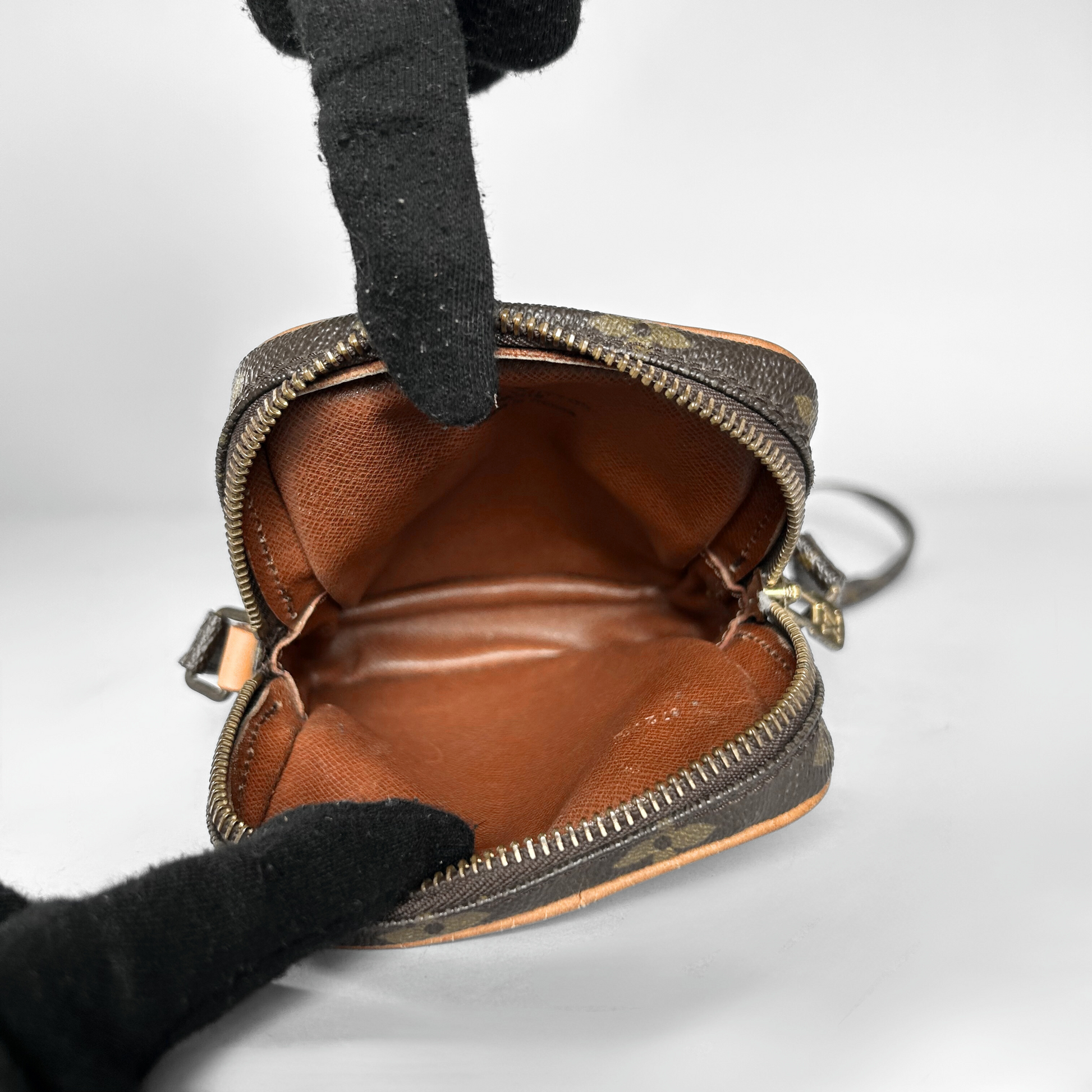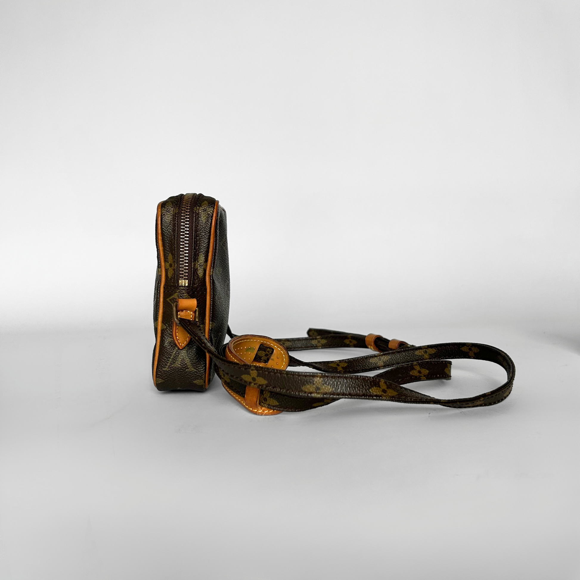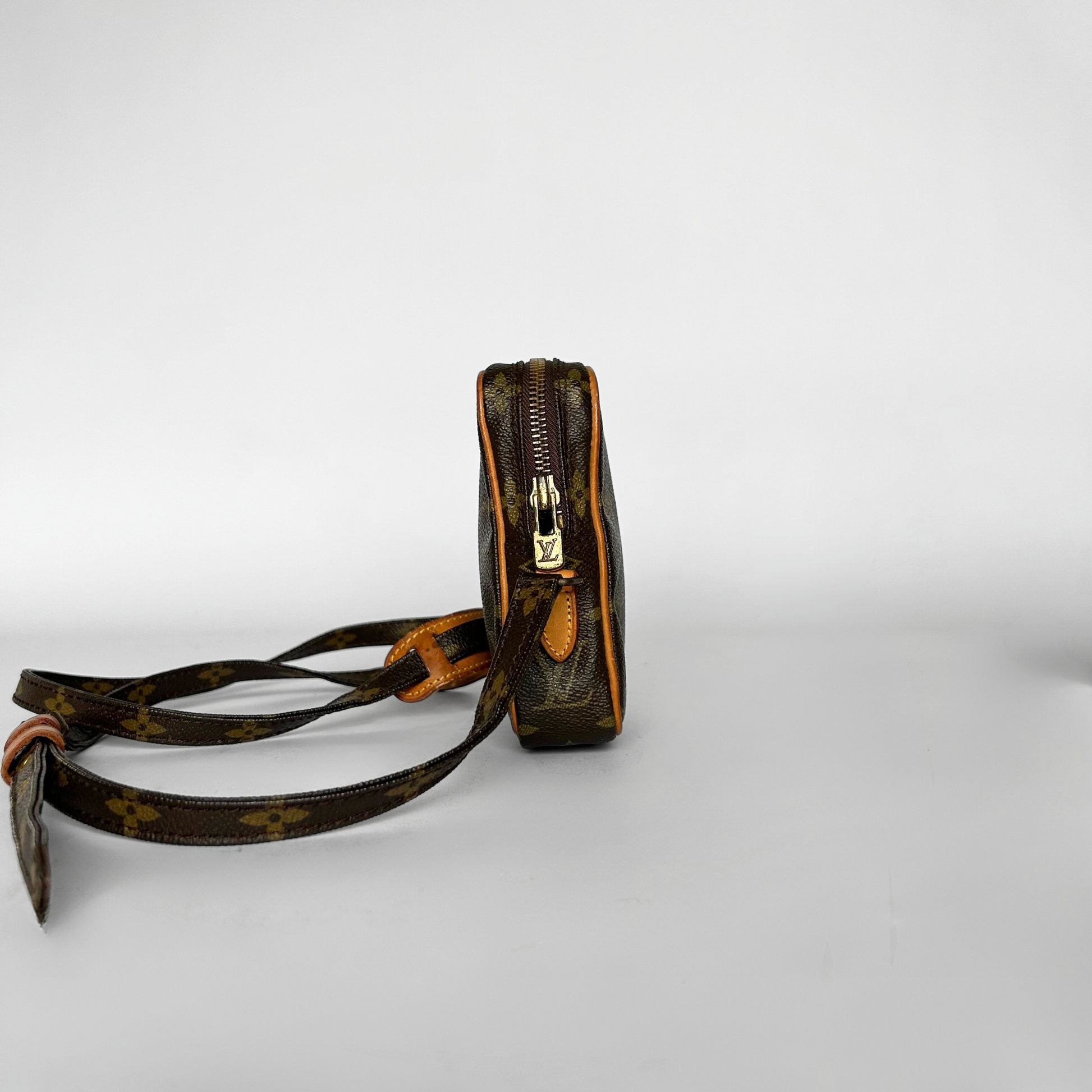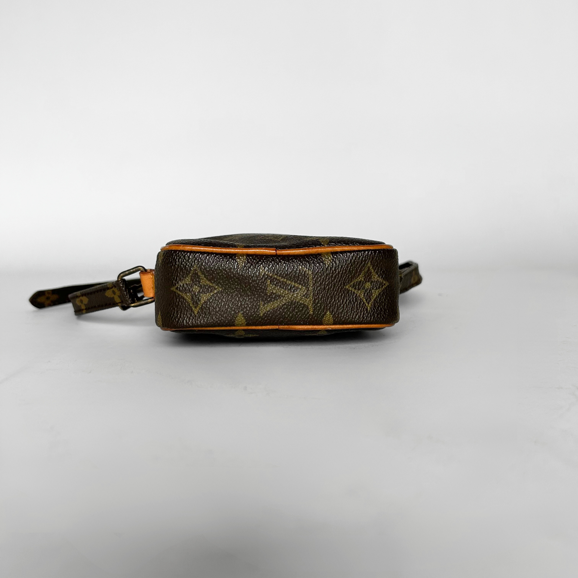 Louis Vuitton Danube Mini in Monogram Canvas. The bag has Vachetta leather details and gold-colored hardware. The classic Monogram Canvas has been Louis Vuitton's trademark design since it was first introduced in 1896. The graphic symbols, including the quatrefoils and flowers, as well as the LV Monogram were used to prevent counterfeiting in the early days when it was first patented. Made of coated canvas, the Monogram's traditional look is also endured by its durability.