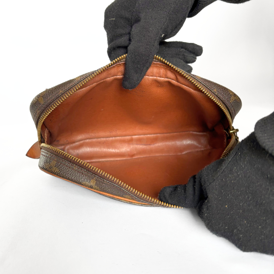 The bag has gold-coloured hardware and opens with a zipper. The main compartment has no extra pockets. The strap has the same monogram print as the bag and the monogram strap is adjustable.