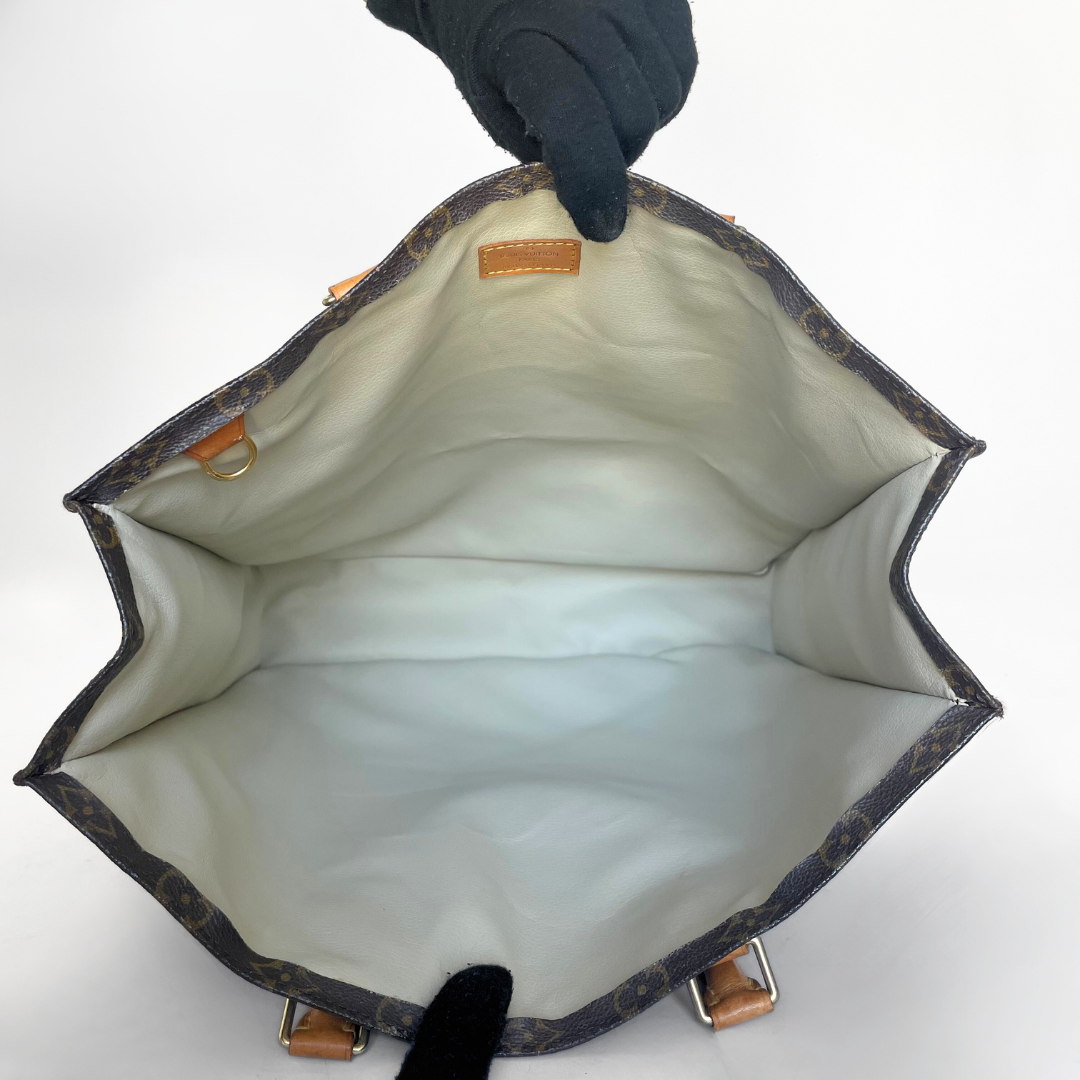 This stylish handbag is crafted in the Louis Vuitton monogram canvas and features vachetta cowhide leather top handles, gold-colored hardware, and an open top to a beige pebbled interior. It makes a perfect fit for any sized laptop, work essentials, or daily go-to goodies!