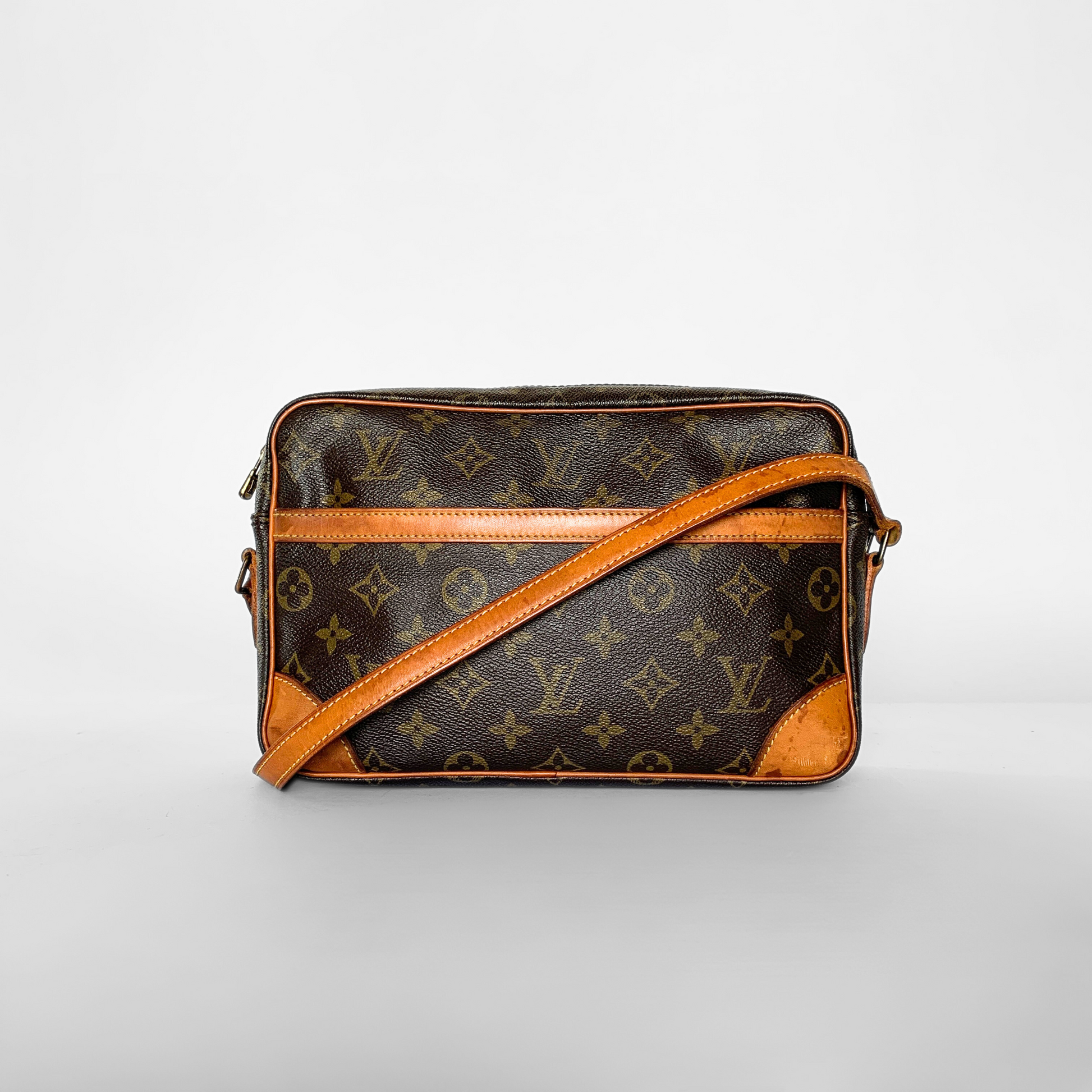 Louis Vuitton Trocadero in Monogram Canvas. The crossbody bag has Vachetta leather details and a leather shoulder strap. The strap is adjustable at seven points. This bag can be worn both as a shoulder bag and as a crossbody bag. The hardware is gold-colored. The main compartment closes with a gold-colored zipper. The inside lining is made of leather and contains a zipper pocket. On the front of the bag there is a slip-in pocket. This bag is perfect for everyday wear and big enough to hold all your daily essentials.